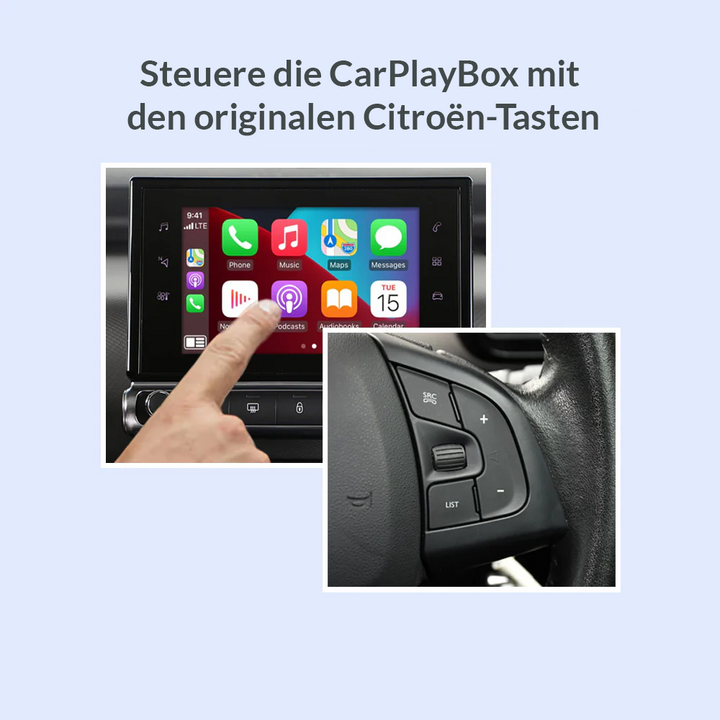 The CarplayBox from CarOptions integrates seamlessly with the infotainment system of your Citroën for Apple CarPlay, Android Auto.